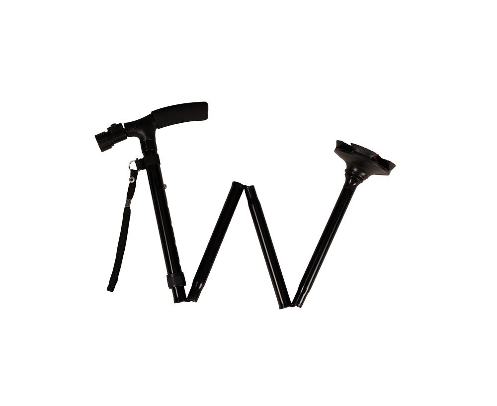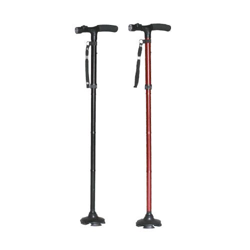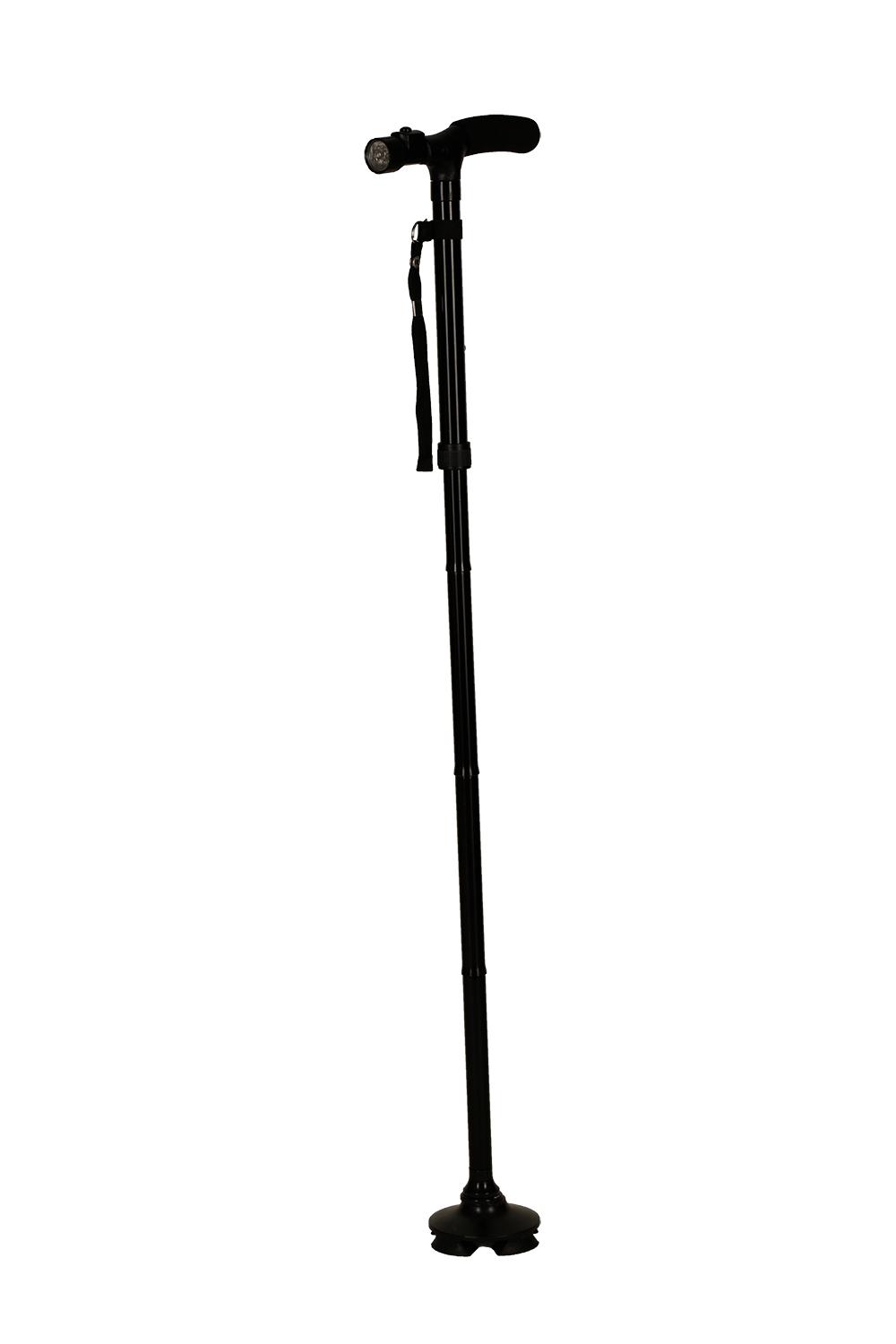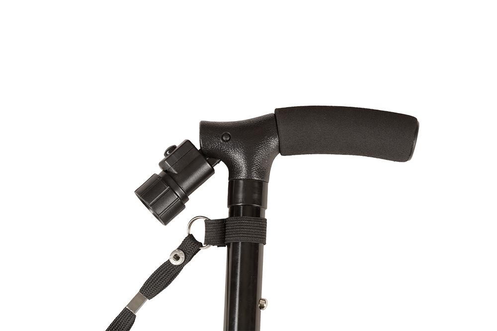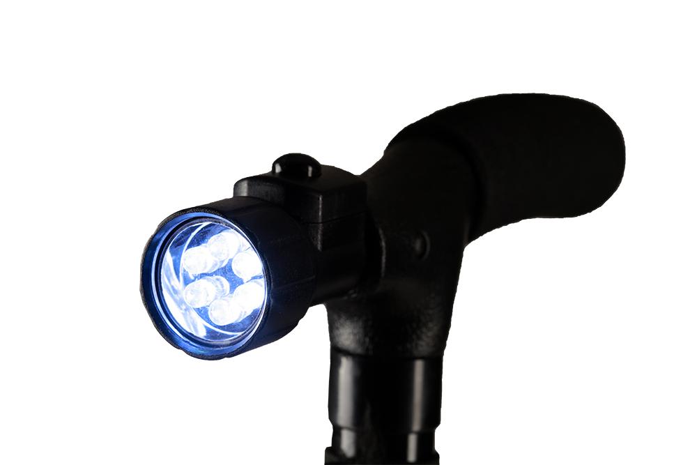 Bastone con luce pieghevole, canna in alluminio colore nero o rosso. Luce a led direzionabile e azionabile per mezzo di un pulsante posto sul manico imbottito del bastone. Il puntale è basculante e segue l'andamento della caviglia. Quattro piedini posti sotto il puntale permettono al bastone di stare in piedi da solo.