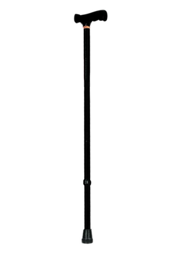 Bastone da passeggio regolabile in altezza per mezzo di un bottore retrattile, canna in alluminio di colore nero, impugnatura tipo "Derby" in legno, puntale in gomma antiscivolo.
