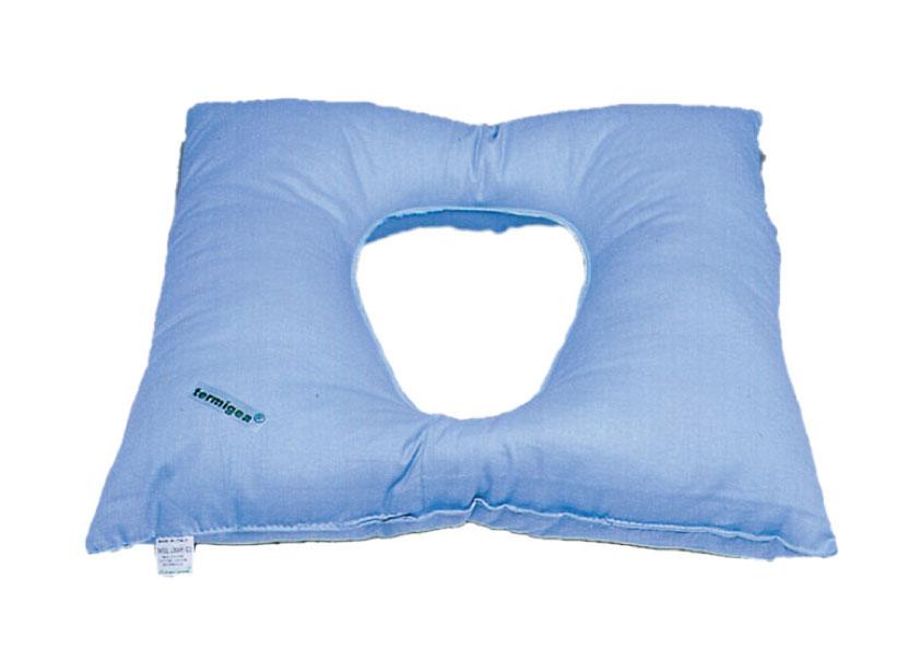 Cuscino antidecubito in fibra cava siliconata con foro centrale che crea uno scarico nella parte centrale del cuscino.
