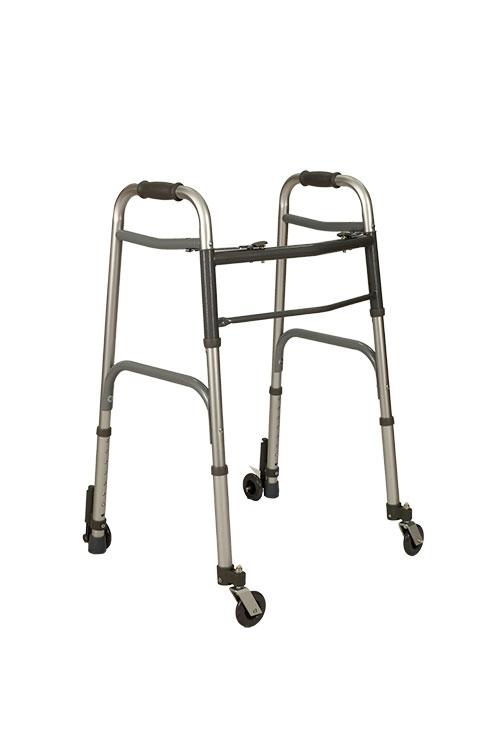 Deambulatore pieghevole con 4 ruote e freno a pressione. Adatto per interni o pavimentazioni non sconnesse. Consente una deambulazione sicura e controllata. Una leggera pressione delle braccia ne rallenta il movimento. Struttura in alluminio anodizzato molto igienica e duratura nel tempo.