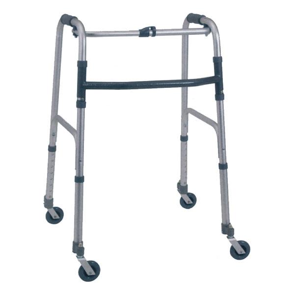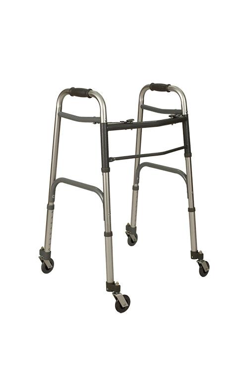 Deambulatore pieghevole con quattro ruote piroettante. Tubolari in alluminio anodizzato maniglie antisdrucciolo in pvc, regolabile in altezza e richiudibile premendo due comodi pulsanti ( disponibile anche nella versione con un pulsante).