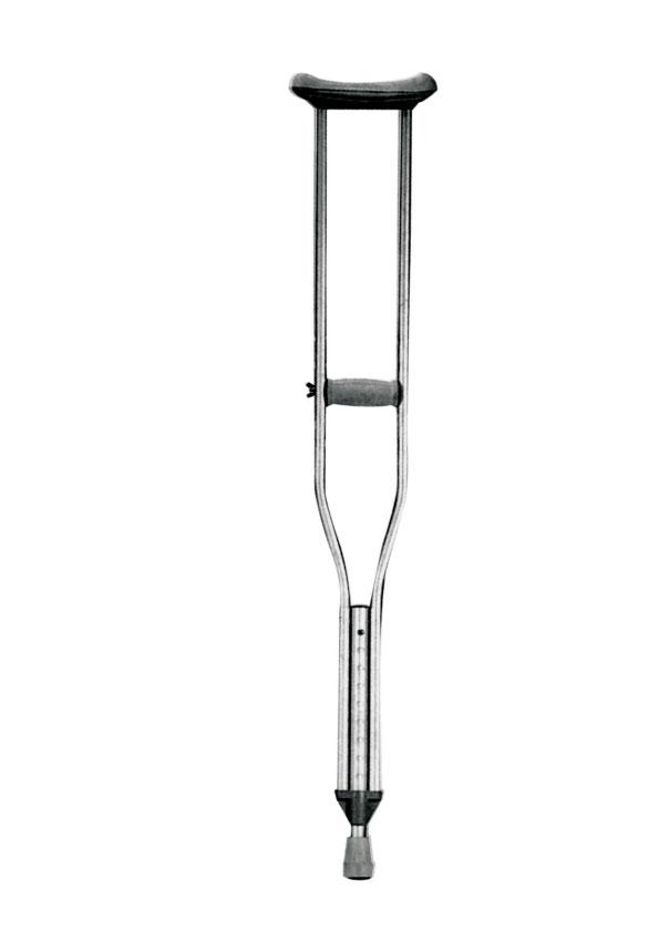 Grucce sottoascellari regolabili in altezza in alluminio anodizzato con impugnatura e supporto sottoascellare realizzato in materiale morbido, puntale in gomma antiscivolo.