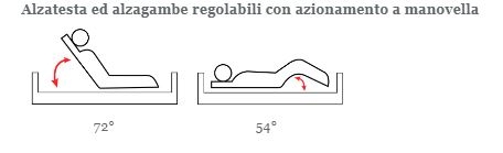 Altezza alzatesta regolabile tramite la manovella fino a 72°, altezza regolabile alzagambe 54°