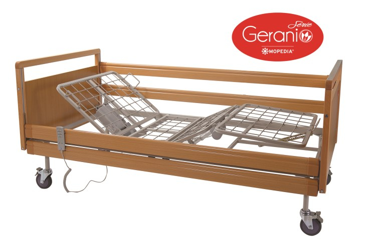 Il letto da degenza ha una struttura interna tubolare in acciaio verniciato a polveri, una rete di acciaio elettrosaldata sul perimetro e la struttura esterna in legno. Il letto è montato su quattro ruote piroettanti da 125mm a blocco totale, garantendo sicurezza e facilità di movimento. Il prodotto dispone di un poggiaschiena e un poggiagambe regolabili elettronicamente in altezza.