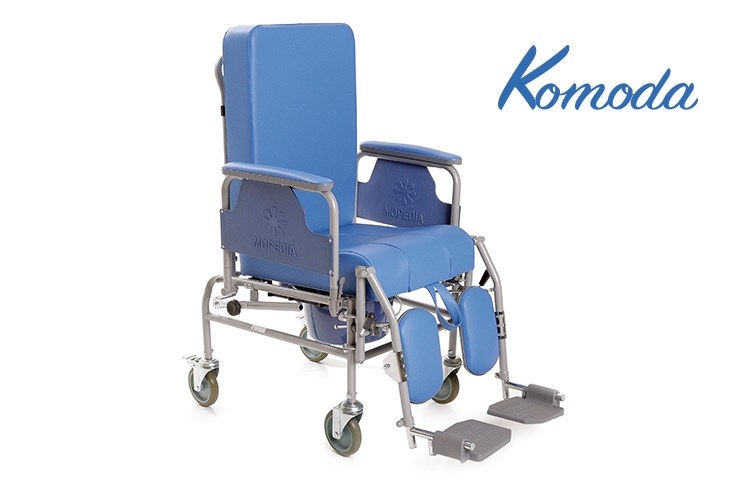 La sedia comoda con schienale ribaltabile è ideale per garantire comodità al paziente. La struttura è a telaio rigido in acciaio verniciato a polveri, molto resistente e duraturo. Lo schienale è ribaltabile da 0° a 45° con ritorno semiautomatico a molla ed è estraibile, come la seduta. Il rivestimento e l'imbottitura della seduta e dello schienale sono in materiale ignifugo, testato secondo norma EN 1021-1 e EN 1021-2. I poggiapiedi e poggiapolpacci sono regolabili in altezza ed estraibili a loro volta lateralmente. La sedia dispone di 4 ruote piroettanti di cui 2 con freno e di WC estraibile e lavabile.