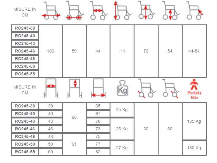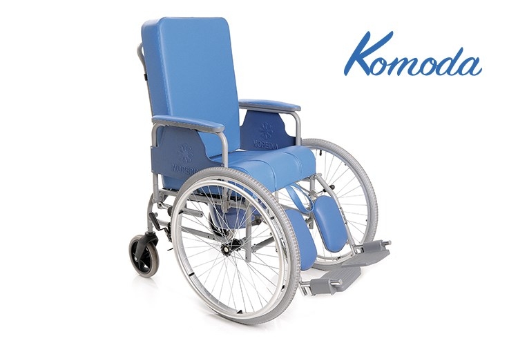 La sedia comoda con autospinta anteriore dispone di una struttura a telaio rigido in acciaio verniciato a polveri. Le due ruote da 60 cm di diametro anteriori con freno a lamina permettono l'autospinta del paziente e si affiancano alle due posteriori da 20 cm di diametro. La sedia ha uno schienale estraibile e ribaltabile fino a 45° con ritorno a molla. Inoltre dispone di una seduta imbottita con materiale ignifugo ed estraibile. Le pedane come i poggiapiedi e i poggiapolpacci sono elevabili in altezza ed estraibili lateralmente. La sedia ha anche un WC estraibile e lavabile.
