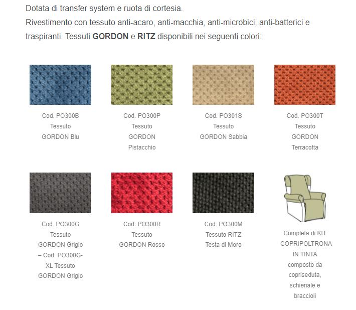 La poltrona elevabile è la sintesi perfetta tra eleganza e funzionalità. Estremamente stabile ed ergonomica, è studiata per garantire il massimo comfort anche per le sedute di lunga durata. La poltrona è disegnata, progettata e prodotta in Italia, ed è dotata di 2 motori per la funzione relax e quella mettinpiedi. Il prodotto è realizzato con tessuto gordon anti-acaro, antimacchia, anti-microbico, anti-batterico e traspirante, da poter abbinare anche agli arredi di pregio.