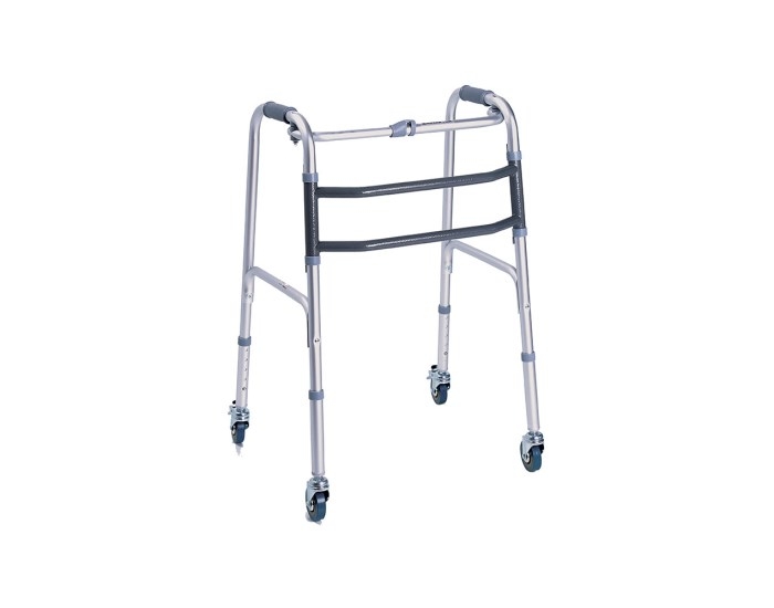 Il deambulatore pieghevole dispone di quattro ruote piroettanti di cui due, quelle posteriori, sono fisse con freno di stazionamento azionabile tramite due leve poste sotto le manopole. Questo modello di deambulatore, inoltre, ha una struttura ad altezza regolabile in alluminio anodizzato e può essere piegato tramite lo sblocco di due leve.