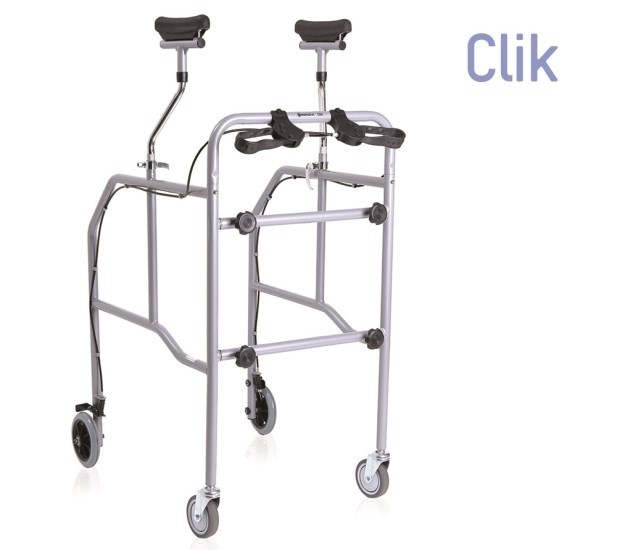 Il deambulatore smontabile ha struttura in acciaio verniciato leggera e molto duratura che può essere smontata nei lati durante l'inutilizzo. Il prodotto dispone di quattro ruote piroettanti di cui due con freno manuale azionabile dalle leve superiori. Il deambulatore ha gli appoggi sottoascellari regolabili e imbottiti, oltre a altezza, larghezza e profondità regolabili.