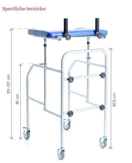 Il deambulatore possiede una struttura resistente e leggera in acciaio verniciato smontabile. Il prodotto è pensato per dare totale sostegno ai pazienti grazie all'appoggio antibrachiale a tavolo, molto ampio, con incavo, imbottito e regolabile in altezza. Grazie alle due maniglie superiori il tavolo può essere regolato anche nell'inclinazione e in larghezza. Il deambulatore ha quattro ruote piroettanti di cui due con freni.