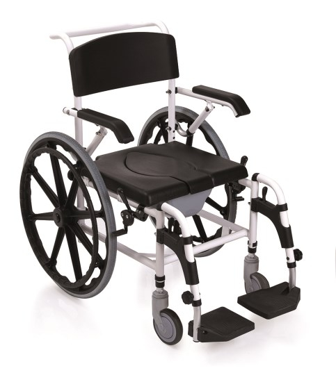 La sedia comoda è pensata per cercare di soddisfare ogni esigenza del paziente. La struttura è realizzata in alluminio verniciato con vernicie epossidica ed è regolabile in altezza. Il prodotto può essere utilizzato per wc, grazie all'apertura centrale posta sulla seduta che permette l'uso del secchio. Inoltre, grazie allo schienale estraibile e ai braccioli ribaltabili può essere comodamente impiegata anche in doccia. La sedia è ad autospinta, dispone dunque di due ruote posteriori con sistema quick release da 60 cm e due ruote anteriori piroettanti da 12,5 cm. Le pedane sono girevoli, regolabili in altezza ed estraibili. Schienale e seduta sono imbottiti in PU.