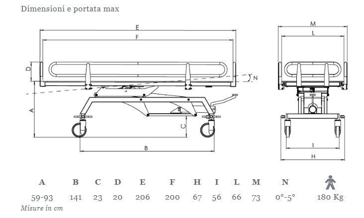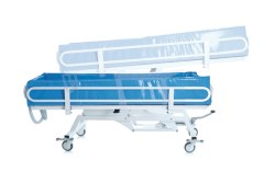 La barella per doccia è un prodotto indicato per il lavaggio e il trasferimento dei pazienti allettati. La struttura è in acciaio verniciato a polveri con trattamento antiruggine di derivazione automotive, per una massima durata nel tempo. La barella dispone di una copertura imbottita in PVC rinforzata con poliestere, priva di ftalati e sanificabile. La struttura può essere elevata idraulicamente e il piano di lavaggio può essere inclinato fino a 5° con molla a gas per un migliore drenaggio. La barella ha una larghezza minima che ne consete l'uso anche in spazi ristretti, inoltre è dotata di sponde ribaltabili (180°) per spostare e posizionare il paziente con molta facilità. La barella dispone di ruote ad alto scorrimento con freno a blocco totale.