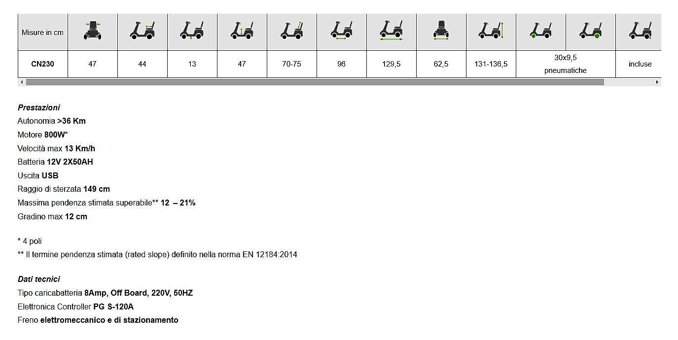 Nello specifico la capacità di carico massimo dello Scooter elettrico Mobility CN230 è di 158 kg. È dotato di numerose funzioni: sedile girevole, regolabile in inclinazione e in profondità, il selettore della velocità di guida, la presa di corrente e la porta USB. E' dotato,inoltre, di una funzione di regolazione della larghezza del bracciolo che ne consente l'utilizzo anche all'utente più robusto.