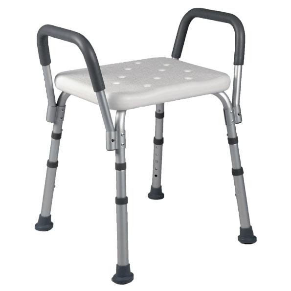 Sedile da doccia con braccioli estraibili, regolabile in altezza, seduta antiscivolo con fori per il drenaggio dell'acqua. Struttura in alluminio anodizzato con puntali in gomma antiscivolo ad effetto ventosa. I braccioli sono estraibili e dotati di rivestimento morbido antiscivolo.