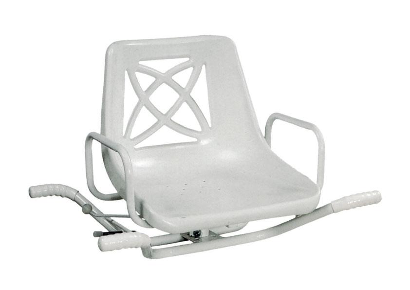 Sedile per vasca da bagno girevole. Telaio in acciaio inox verniciato bianco con comodi braccioli. Sedile in plastica, facile da posizionare sulla vasca per mezzo di due battute antisdrucciolo rivestite in gomma. Una leva posta sotto la seduta, permette al sedile di ruotare per poter accedere aal'interno della vasca.