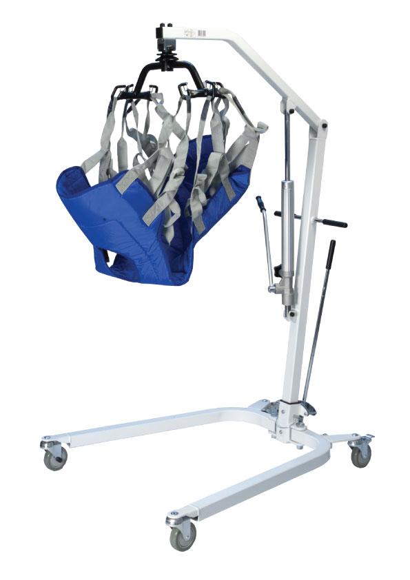 Sollevatore manuale destinato al sollevamento di persone con difficolta' motorie. Necessita di un'altra persona in grado di azionare il pistone idraulico. Possibilita' di sollevare il paziente anche da terra. Struttura in acciaio verniciato antigraffio bianco.