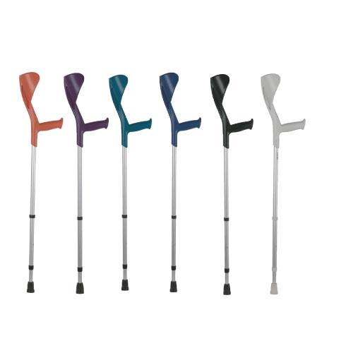 Stampella bastone canadese, canna in alluminio anodizzato, supporto antibrachiale in plastica, puntale in gomma antiscivolo. Regolabile in altezza.